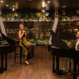 Embarque num catamarã confortável e espaçoso e desfrute da performance cativante do pianista, que vai animar e manter o ambiente animado durante toda a noite. Ouça uma bela cantora que se junta à festa e aumenta a emoção evocada pela música.