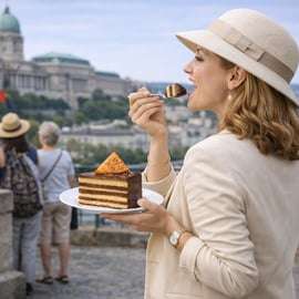 Complete sua jornada com uma fatia de Dobos torta, uma das sobremesas mais emblemáticas da Hungria, criada na era de ouro da cultura do café de Budapeste. Ao saboreá-la, descubra a história por trás deste elegante bolo, que se tornou um símbolo de requinte em todo o Império Austro-Húngaro.